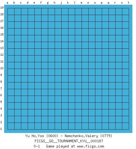 Last move : 0-1 2018 June 14 2:43:28 [Event "FICGS__GO__TOURNAMENT_KYU__000187"] [Site "FICGS"] [Date "2018.05.14"] [Round "1"] [Black "Yu Ho,Yoo"] [White "Nemchenko,Valery"] [Result "0-1"] [Rating 1 "0600"] [Rating 2 "0779"] 0-1 This go game has been lost on time (started : 2018.05.14 19:46:17) Here are the names of the openings (joseki) played in the four corners : Player White won this Go (weiqi, baduk) game. Follow this game move after move (download)Big groups never die. (Anonymous) After growing wildly for years, the field of computing appears to be reaching its infancy. (John Pierce)