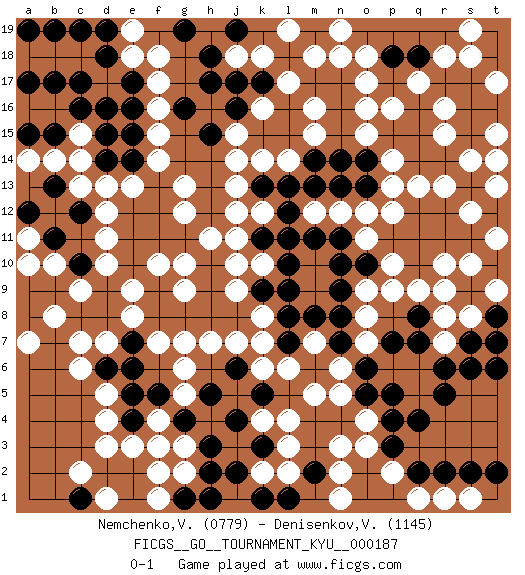 Last move : 0-1 2018 December 22 11:38:40 [Event "FICGS__GO__TOURNAMENT_KYU__000187"] [Site "FICGS"] [Date "2018.05.14"] [Round "1"] [Black "Nemchenko,Valery"] [White "Denisenkov,Valentin"] [Result "0-1"] [Rating 1 "0779"] [Rating 2 "1145"] 1.q16 d4 2.d16 c14 3.q4 o17 4.p17 o16 5.p18 f17 6.e17 f16 7.e16 f14 8.e15 f15 9.e14 d12 10.f13 g13 11.f12 o3 12.p4 o4 13.p5 r10 14.p3 k4 15.o2 n2 16.o1 n1 17.p1 n3 18.o5 n5 19.o6 n6 20.n7 k6 21.m6 m5 22.l7 k7 23.m8 r7 24.r5 r13 25.q15 p13 26.q14 q13 27.r14 o18 28.o19 n19 29.p19 n18 30.s13 s12 31.t12 s14 32.t14 t13 33.s15 t15 34.s16 t11 35.t16 t14 36.s6 e13 37.e12 d13 38.d14 d10 39.e11 d11 40.e10 e9 41.f9 e8 42.f8 f7 43.g8 g7 44.h8 k8 45.k9 k10 46.l9 j9 47.j8 j10 48.l10 k12 49.k11 j11 50.l11 j12 51.l12 k14 52.l13 l14 53.k13 j13 54.m14 m16 55.n14 n12 56.o14 p14 57.p15 o15 58.o13 o12 59.n13 m12 60.m13 o9 61.t6 l6 62.l8 m7 63.n8 c15 64.c16 c18 65.d18 f18 66.c17 b18 67.b17 a18 68.a17 e18 69.c19 e19 70.d19 s8 71.s7 r8 72.t8 t9 73.t7 o7 74.p7 o8 75.q7 q9 76.q8 p9 77.r6 c13 78.b15 b14 79.a15 a14 80.d15 p16 81.r17 r18 82.r19 s18 83.q18 s19 84.q19 q17 85.s17 r16 86.t18 r15 87.t19 pass 88.q18 t17 89.b19 pass 90.h5 h7 91.h9 g12 92.g11 f10 93.f11 g10 94.h10 h11 95.m11 p12 96.l15 j14 97.j4 f4 98.g4 g3 99.h3 f3 100.k3 l3 101.j2 k2 102.k1 l2 103.l1 g2 104.f5 g6 105.k5 l4 106.j6 j7 107.n9 m15 108.l16 g5 109.e5 d5 110.e4 e3 111.e7 d7 112.k15 l17 113.k17 j15 114.j16 k16 115.h17 q1 116.q2 p2 117.r2 r1 118.s2 s1 119.t2 pass 120.l18 k18 121.j17 j18 122.h18 m18 123.j19 l19 124.g19 pass 125.o10 p10 126.n11 o11 127.n10 pass 128.h15 pass 129.e6 pass 130.h2 pass 131.d6 c6 132.s9 r9 133.t10 s10 134.c8 c7 135.d8 pass 136.d9 g9 137.c10 b8 138.b9 c9 139.a10 pass 140.a8 a7 141.a9 a11 142.b11 b10 143.a12 a10 144.b13 pass 145.a19 t9 146.g1 f1 147.h1 pass 148.g16 pass 149.e1 f2 150.e2 d3 151.d2 c2 152.c1 d1 153.c12 pass 154.p18 pass 155.m2 pass 0-1 Here are the names of the openings (joseki) played in the four corners : Corner d16 : d16 c14 Hoshi (Hwajeom, Seongjeom, Xingwei`) 4-4 Point. The star or hoshi (4-4) point, emphasizing influence at the potential expense of territory. Ikken Kakari (Hankan Keolch'im, Yi Gua`jiao~, 1-Space Low Approach). White 2 is the standard approach move to the 4-4. Corner q16 : q16 o17 Hoshi (Hwajeom, Seongjeom, Xingwei`) 4-4 Point. The star or hoshi (4-4) point, emphasizing influence at the potential expense of territory. Ikken Kakari (Hankan Keolch'im, Yi Gua`jiao~, 1-Space Low Approach). White 2 is the standard approach move to the 4-4. Corner q4 : q4 o3 Hoshi (Hwajeom, Seongjeom, Xingwei`) 4-4 Point. The star or hoshi (4-4) point, emphasizing influence at the potential expense of territory. Ikken Kakari (Hankan Keolch'im, Yi Gua`jiao~, 1-Space Low Approach). White 2 is the standard approach move to the 4-4. Player White won this Go (weiqi, baduk) game. Follow this game move after move (download)Win the early ko to win the game. (Anonymous) A good teacher is like a candle - it consumes itself to light the way for others. (Author unknown)