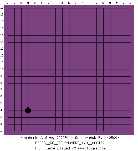 Last move : 1-0 2018 June 15 2:50:44 [Event "FICGS__GO__TOURNAMENT_KYU__000187"] [Site "FICGS"] [Date "2018.05.14"] [Round "1"] [Black "Nemchenko,Valery"] [White "Grabarchuk,Eva"] [Result "1-0"] [Rating 1 "0779"] [Rating 2 "0500"] 1.d4 1-0 This go game has been lost on time (started : 2018.05.14 19:46:17) Here are the names of the openings (joseki) played in the four corners : Corner d4 : d4 1-0 Hoshi (Hwajeom, Seongjeom, Xingwei`) 4-4 Point. The star or hoshi (4-4) point, emphasizing influence at the potential expense of territory. Player Black won this Go (weiqi, baduk) game. Follow this game move after move (download)Be a little patient. Keshi works ! (Anonymous) Tomorrow's what you make of it. (Horatio Caine, C.S.I. Miami)