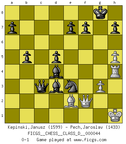 Last move : 0-1 2008 January 1 15:47:34 [Event "FICGS__CHESS__CLASS_D__000044"] [Site "FICGS"] [Date "2007.05.07"] [Round "1"] [White "Kepinski,Janusz"] [Black "Pech,Jaroslav"] [Result "0-1"] [WhiteElo "1599"] [BlackElo "1433"] 1.e4 d5 2.e5 c5 3.d3 Nc6 4.Bf4 Qb6 5.b3 g5 6.Bxg5 Bg7 7.Nc3 Bxe5 8.Bd2 Nd4 9.Nge2 Qe6 10.a3 Nh6 11.b4 Ng4 12.f4 Bf6 13.h4 Bd7 14.bxc5 Rc8 15.a4 Rxc5 16.Ra3 O-O 17.Qb1 Rfc8 18.Rh3 Rxc3 19.Rxc3 Rxc3 20.Bxc3 Nxe2 21.Bxe2 Bxc3+ 22.Kf1 Ne3+ 23.Kg1 Bd4 24.Kh1 Qh6 25.Qg1 Qxf4 26.g3 Qc7 27.Rh2 Bxa4 28.Qe1 Bxc2 29.h5 b5 30.Rh4 Qc3 31.Qf2 Bxd3 0-1 Scandinavian (centre counter) defense Kingside Castling by player Black (move 16) Player Black won this chess game. Follow this game move after move (download)There's never before been a Chess player with such a thorough knowledge of the intricacies of the game and such an absolutely indomitable will to win. I think Bobby is the greatest player that ever lived. (Lisa Lane) Obendrein hat der FIDE-Präsident den Revolutionsführer Gaddafi zum »Großmeister« ernannt, am Ende der WM. Das ist lächerlich! (Joel Lautier) Dios mío, Bobby Fischer juega tan simple. (Alexei Suetin) Je ne crois pas en la psychologie, je crois aux bons coups. (Robert Fischer) Control your own destiny or someone else will. (Jack Welch)