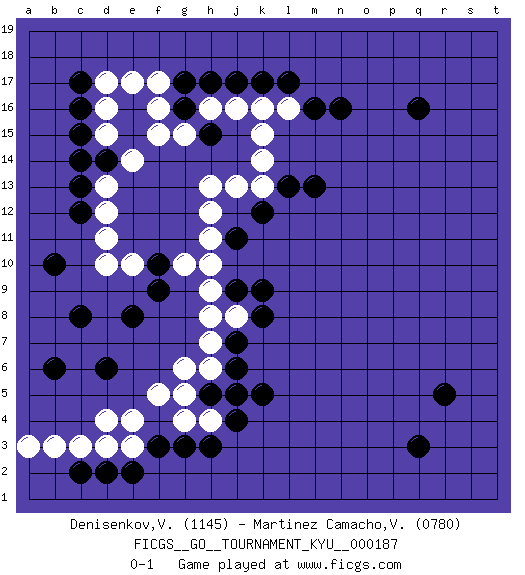 Last move : 0-1 2018 September 2 11:30:15 [Event "FICGS__GO__TOURNAMENT_KYU__000187"] [Site "FICGS"] [Date "2018.05.14"] [Round "1"] [Black "Denisenkov,Valentin"] [White "Martinez Camacho,Victor Hugo"] [Result "0-1"] [Rating 1 "1145"] [Rating 2 "0780"] 1.q16 d4 2.q3 d16 3.f3 d10 4.d2 k16 5.r5 f5 6.j4 g4 7.g3 h4 8.h3 e4 9.j6 e3 10.e2 d3 11.c17 j5 12.k5 h6 13.h5 g5 14.j5 g6 15.j9 h7 16.j7 h8 17.j11 j8 18.k8 h9 19.k9 h10 20.c16 e17 21.c13 d13 22.c12 d12 23.d14 d15 24.c15 e14 25.c14 d11 26.b10 h11 27.k12 h13 28.n16 h12 29.m13 k13 30.l13 k14 31.l17 k15 32.k17 j13 33.h17 d17 34.g16 l16 35.m16 g15 36.h15 f15 37.c8 c3 38.c2 b3 39.b6 a3 40.d6 j16 41.j17 h16 42.g17 f17 43.e8 f16 44.f10 e10 45.f9 g10 0-1 This go game has been lost on time (started : 2018.05.14 19:46:17) Here are the names of the openings (joseki) played in the four corners : Corner d4 : d4 f3 Hoshi (Hwajeom, Seongjeom, Xingwei`) 4-4 Point. The star or hoshi (4-4) point, emphasizing influence at the potential expense of territory. Ikken Kakari (Hankan Keolch'im, Yi Gua`jiao~, 1-Space Low Approach). Black 2 is the standard approach move to the 4-4. Corner d16 : d16 c17 Hoshi (Hwajeom, Seongjeom, Xingwei`) 4-4 Point. The star or hoshi (4-4) point, emphasizing influence at the potential expense of territory. Player White won this Go (weiqi, baduk) game. Follow this game move after move (download)The weak player fears ko, the strong player seeks it. (Bill Taylor) Memory... is the diary that we all carry with us. (Oscar Wilde, The Importance of Being Earnest)