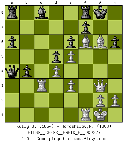 Last move : 1-0 2018 May 28 13:39:59 [Event "FICGS__CHESS__RAPID_B__000277"] [Site "FICGS"] [Date "2018.05.14"] [Round "1"] [White "Kuliy,Oleksandr"] [Black "Horoshilov,Andrey"] [Result "1-0"] [WhiteElo "1854"] [BlackElo "1800"] 1.d4 d5 2.c4 c6 3.Nf3 e6 4.Nc3 Nf6 5.cxd5 cxd5 6.Bg5 Be7 7.e3 O-O 8.Bd3 Bb4 9.O-O Bxc3 10.bxc3 Nbd7 11.Rc1 Qa5 12.a4 h6 13.Bh4 a6 14.Ne5 Ne4 15.f4 Nxe5 16.fxe5 Nxc3 17.Qe1 Qxa4 18.Rxc3 b5 19.Qg3 b4 20.Bf6 g6 21.Bxg6 1-0 QGD Slav : 3.Nf3 Kingside Castling by player Black (move 7) Kingside Castling by player White (move 9) Player White won this chess game. Follow this game move after move (download)Bobby is the most misunderstood, misquoted celebrity walking the face of this earth. (Yasser Seirawan) Ich hatte Angst gegen einen russischen Großmeister zu verlieren, und er befürchtete gegen einen kleinen Jungen zu verlieren. (über ein Remis gegen Juri Awerbach). (Robert James Fischer) El ganar no lo es todo... pero el perder es nada. (Mednis) Il n'y a pas de prix trop élevé au scalp de l'ennemi. (Koblentz) Everybody lies. (Gregory House, House M.D.)