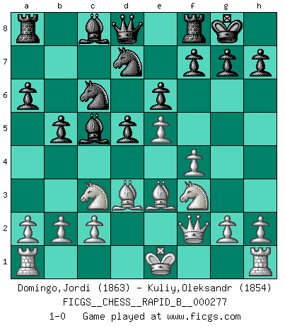 Last move : 1-0 2018 July 19 20:7:4 [Event "FICGS__CHESS__RAPID_B__000277"] [Site "FICGS"] [Date "2018.05.14"] [Round "1"] [White "Domingo,Jordi"] [Black "Kuliy,Oleksandr"] [Result "1-0"] [WhiteElo "1863"] [BlackElo "1854"] 1.e4 e6 2.d4 d5 3.Nc3 Nf6 4.e5 Nfd7 5.f4 c5 6.Nf3 Nc6 7.Be3 a6 8.Qd2 b5 9.dxc5 Bxc5 10.Bd3 O-O 11.Qf2 1-0 This chess game has been lost on time (started : 2018.05.14 21:49:19) French : Steinitz, Boleslavsky variation Kingside Castling by player Black (move 10) Player White won this chess game. Follow this game move after move (download)Who is your opponent tonight, tonight I am playing against the Black pieces. (Akiba Rubinstein) Zum Sieg gelangt man nicht, wenn man gut, sondern nur wenn man besser spielt (Savielly Grigorievitsch Tartakower) El Ajedrez, como cualquier otra actividad creativa, puede existir solo a través de méritos combinados de aquellos que tienen talento creativo y de aquellos que tienen la habilidad de organizar un trabajo creativo. (Mikhail Botvinnik) Je fais ceci parce que dans cinquante coups j'obtiendrai cela; je m'appelle Mikhail Moisevitch Botvinnik. (Botvinnik) All men can see these tactics whereby I conquer, but what none can see is the strategy out of which victory is evolved. (Sun Tzu)