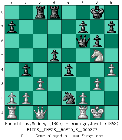 Last move : 0-1 2018 June 8 2:17:15 [Event "FICGS__CHESS__RAPID_B__000277"] [Site "FICGS"] [Date "2018.05.14"] [Round "1"] [White "Horoshilov,Andrey"] [Black "Domingo,Jordi"] [Result "0-1"] [WhiteElo "1800"] [BlackElo "1863"] 1.e4 e5 2.Nf3 d6 3.h3 Nf6 4.Nc3 Be7 5.Bc4 O-O 6.O-O c6 7.d4 b5 8.Bd3 Qc7 9.d5 b4 10.Ne2 cxd5 11.Ng3 dxe4 12.Nxe4 d5 13.Nxf6+ Bxf6 14.Be2 Rd8 15.Bg5 Bxg5 16.Nxg5 e4 17.Bh5 g6 18.Bg4 Nc6 19.Bxc8 Raxc8 20.h4 Qf4 21.g3 Qf6 22.Qc1 Nd4 23.c3 Ne2+ 0-1 Philidor's defense Kingside Castling by player Black (move 5) Kingside Castling by player White (move 6) Player Black won this chess game. Follow this game move after move (download)Only sissies Castle. (Rob Sillars) Deine Wertungszahl - vorausgesetzt einige Jahre schachliche Anstrengung - entspricht etwa dem zehnfachen Deines IQ plus 1000. (Jonathan Levitt) Hoy en día, si tu no eres un Gran Maestro a los 14 años, es mejor que lo olvides. (Anand Viswanathan) Horreur, mais aussi harmonie suprême : qu'y avait-il en effet au monde en dehors des échecs ? Le brouillard, l'inconnu, le non-être... (Vladimir Nabokov) They say poker is a zero-sum game. It must be, because every time I play my sum ends up zero. (Max Shapiro)