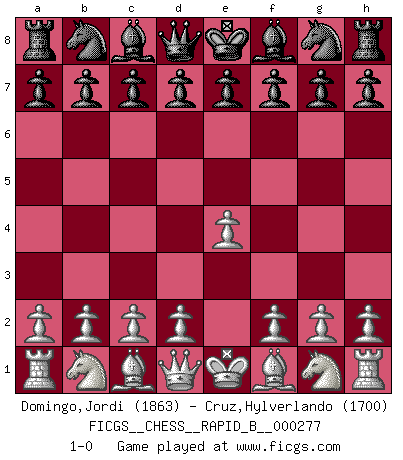 Last move : 1-0 2018 June 14 2:43:28 [Event "FICGS__CHESS__RAPID_B__000277"] [Site "FICGS"] [Date "2018.05.14"] [Round "1"] [White "Domingo,Jordi"] [Black "Cruz,Hylverlando"] [Result "1-0"] [WhiteElo "1863"] [BlackElo "1700"] 1.e4 1-0 This chess game has been lost on time (started : 2018.05.14 21:49:19) King's pawn Opening Player White won this chess game. Follow this game move after move (download)Chess holds its master in its own bonds, shackling the mind and brain so that the inner freedom of the very strongest must suffer. (Albert Einstein) Kleine Schachspieler machen Mist, und große Schachspieler machen Mist, aber große machen weniger Mist. (Fritz Sämisch) No nos podemos resistir a la fascinación de un sacrificio ya que la pasión por los sacrificios es parte de la naturaleza de un jugador de Ajedrez. (Rudolf Spielman) La tactique est l'élément le plus important du milieu de jeu. (Siegbert Tarrasch) You have to believe in yourself. (Sun Tzu)