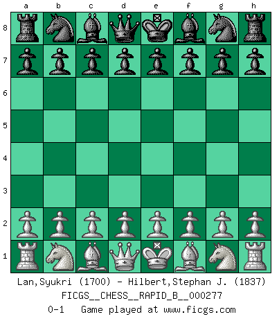 Last move : 0-1 2018 June 14 2:43:28 [Event "FICGS__CHESS__RAPID_B__000277"] [Site "FICGS"] [Date "2018.05.14"] [Round "1"] [White "Lan,Syukri"] [Black "Hilbert,Stephan J."] [Result "0-1"] [WhiteElo "1700"] [BlackElo "1837"] 0-1 This chess game has been lost on time (started : 2018.05.14 21:49:19) Player Black won this chess game. Follow this game move after move (download)The passion for playing Chess is one of the most unaccountable in the world. (H.G. Wells) Den Ruhm habe ich schon, jetzt brauche ich noch das Geld. (Wilhelm Steinitz) Hasta este punto, las blancas han seguido un análisis bien conocido. Pero ahora el hace un error fatal: empieza a usar su propia cabeza. (Siegbert Tarrasch) La conception d'un plan est le processus par lequel un joueur exploite les avantages de sa position tout en s'efforçant d'en réduire au minimum les inconvénients. Afin de garantir le succès, un plan doit toujours se fonder sur un diagnostic objectif des particularités d'une position. La conception d'un plan est d'autant plus difficile que la position est équilibrée, et grandement facilitée lorsqu'il n'existe qu'un seul plan susceptible de répondre aux exigences de la position. (Harry Golombek) The mind is like a parachute, it only functions when its open. (Unknown)