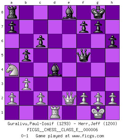 Last move : 0-1 2006 September 3 12:17:1 [Event "FICGS__CHESS__CLASS_E__000006"] [Site "FICGS"] [Date "2006.06.07"] [Round "1"] [White "Guralivu,Paul-Iosif"] [Black "Herr,Jeff"] [Result "0-1"] [WhiteElo "1293"] [BlackElo "1200"] 1.e4 e5 2.Nf3 Nc6 3.Bb5 Nf6 4.O-O d6 5.Re1 Bd7 6.Bxc6 Bxc6 7.Nc3 Be7 8.d4 exd4 9.Nxd4 Bd7 10.e5 dxe5 11.Rxe5 O-O 12.Qe1 Re8 13.Bg5 h6 14.Bxf6 Bxf6 15.Rxe8+ Bxe8 16.Nf3 c6 17.Rd1 Qb6 18.Na4 Qb5 19.b3 Qf5 20.Qe2 b5 21.Nd4 Bxd4 0-1 Ruy Lopez : Berlin defense, 4.O-O, d6 Kingside Castling by player White (move 4) Kingside Castling by player Black (move 11) Player Black won this chess game. Follow this game move after move (download)Bobby Fischer's current state of mind is indeed a tragedy. One of the world's greatest Chess players - the pride and sorrow of American Chess. (Frank Brady) Du musst nicht gut spielen, es reicht, wenn du besser spielst als dein Gegner. (Anonymous) Uno no tiene que jugar muy bien, es suficiente jugar mejor que el oponente. (Siegbert Tarrasch) Il a essayé de se convaincre qu'il pourrait empêcher toutes les erreurs et ne jamais perdre. L'horreur ! Gary Kasparov au sujet de Robert Fischer. Every vice is only an exaggeration of a necessary and virtuous function. (Ralph Waldo Emerson, Journals 1936)