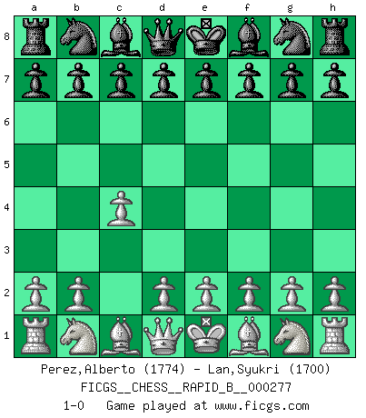 Last move : 1-0 2018 June 14 2:43:28 [Event "FICGS__CHESS__RAPID_B__000277"] [Site "FICGS"] [Date "2018.05.14"] [Round "1"] [White "Perez,Alberto"] [Black "Lan,Syukri"] [Result "1-0"] [WhiteElo "1774"] [BlackElo "1700"] 1.c4 1-0 This chess game has been lost on time (started : 2018.05.14 21:49:19) English Opening Player White won this chess game. Follow this game move after move (download)In blitz, the Knight is stronger than the Bishop. (Vlastimil Hort) Darum geht es im Schach. Einen Tag gibst du deinem Gegner eine Lektion, am nächsten Tag gibt er dir eine. (Robert James Fischer) Con o sin el título, Bobby Fischer fue sin lugar a dudas el mas grande jugador de su época. (Burt Hochberg) Il s'avisa de me proposer d'apprendre les échecs qu'il jouait un peu... me voilà forcené des échecs. J'achète un échiquier, je m'enferme dans ma chambre, j'y passe des jours et des nuits à vouloir apprendre par cur toutes les parties. (Jean-Jacques Rousseau, Confessions) Be who you are, and say what you feel because those who mind don't matter, and those who matter don't mind. (Dr Seuss)