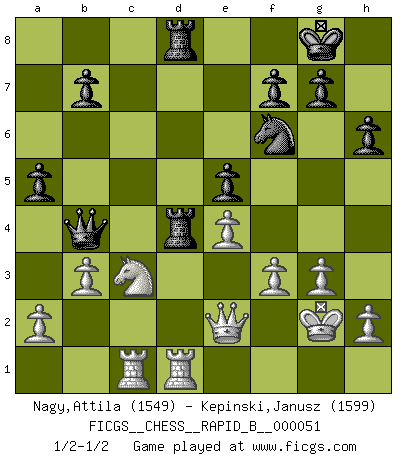Last move : 1/2-1/2 2007 September 2 23:57:57 [Event "FICGS__CHESS__RAPID_B__000051"] [Site "FICGS"] [Date "2007.05.07"] [Round "1"] [White "Nagy,Attila"] [Black "Kepinski,Janusz"] [Result "1/2-1/2"] [WhiteElo "1549"] [BlackElo "1599"] 1.e4 e6 2.b3 d5 3.Bb2 d4 4.Nf3 c5 5.Bb5+ Bd7 6.Bxd7+ Nxd7 7.O-O Be7 8.c3 dxc3 9.Bxc3 Ngf6 10.Re1 O-O 11.d4 Qc7 12.Qd2 Rad8 13.g3 Ne5 14.Nxe5 cxd4 15.Bxd4 Bc5 16.Nf3 Bxd4 17.Nxd4 Qb6 18.Rd1 e5 19.Nc3 Rxd4 20.Qe2 Rfd8 21.Rac1 h6 22.Kg2 a5 23.f3 Qb4 1/2-1/2 French : Reti (Spielmann) variation Kingside Castling by player White (move 7) Kingside Castling by player Black (move 10) This chess game ended in a draw. Follow this game move after move (download)Chess is a terrible game. If you have no center, your opponent has a freer position. If you do have a center, then you really have something to worry about ! (Siegbert Tarrasch) Pläne sind die Träume des Verständigen. (Ernst Freiherr von Feuchtersleben) Todavía soy una víctima del Ajedrez. Tiene toda la belleza del arte y mucho mas. No puede ser comercializado. El Ajedrez es mas puro que el arte en su posición social. (Marcel Duchamp) Il vaut mieux sacrifier les pièces de l'adversaire. (Xavier Tartacover) If passion drives you, let reason holds the reins. (Benjamin Franklin)