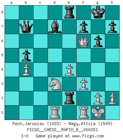 Last move : 1-0 2007 September 18 14:52:33 [Event "FICGS__CHESS__RAPID_B__000051"] [Site "FICGS"] [Date "2007.05.07"] [Round "1"] [White "Pech,Jaroslav"] [Black "Nagy,Attila"] [Result "1-0"] [WhiteElo "1433"] [BlackElo "1549"] 1.d4 d6 2.e4 Nf6 3.Nc3 g6 4.Nf3 Bg7 5.Be2 Bg4 6.O-O O-O 7.Be3 Nc6 8.Qd2 e5 9.d5 Ne7 10.Rad1 Bd7 11.Ne1 b5 12.Nd3 a5 13.a3 Qb8 14.f3 c6 15.dxc6 Bxc6 16.b4 Rc8 17.Nf2 axb4 18.axb4 d5 19.Bc5 d4 20.Bxe7 dxc3 21.Qe3 Qb7 22.Bd6 Ra2 23.Bxe5 Re8 24.Bd4 Rxc2 25.Qd3 Ra2 26.Qxc3 Rxe2 27.Bxf6 Bxf6 28.Qxf6 Bd7 29.Nd3 1-0 This chess game has been lost on time (started : 2007.05.07 19:20:57) Queen's Pawn Kingside Castling by player White (move 6) Kingside Castling by player Black (move 6) Player White won this chess game. Follow this game move after move (download)The stomach is an essential part of the Chess master. (Bent Larsen) Deine Wertungszahl - vorausgesetzt einige Jahre schachliche Anstrengung - entspricht etwa dem zehnfachen Deines IQ plus 1000. (Jonathan Levitt) ¿Se han dado cuenta de que Fischer casi nunca ha tenido piezas malas? El las intercambia y las piezas malas se quedan con sus oponenets. (Yuri Balashov) Horreur, mais aussi harmonie suprême : qu'y avait-il en effet au monde en dehors des échecs ? Le brouillard, l'inconnu, le non-être... (Vladimir Nabokov) War is the child of passion, passion is the child of narcissism and narcissism is the child. (...) Another game ? (Thibault de Vassal)