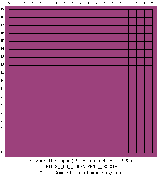 Last move : 0-1 2018 June 15 2:50:44 [Event "FICGS__GO__TOURNAMENT__000015"] [Site "FICGS"] [Date "2018.05.15"] [Round "1"] [Black "Salanok,Theerapong"] [White "Bromo,Alexis"] [Result "0-1"] [Rating 2 "0936"] 0-1 This go game has been lost on time (started : 2018.05.15 18:33:6) Here are the names of the openings (joseki) played in the four corners : Player White won this Go (weiqi, baduk) game. Follow this game move after move (download)Go is to western chess what philosophy is to double entry accounting. (from Shibumi, by Trevanian) Creativity is inventing, experimenting, growing, taking risks, breaking rules, making mistakes, and having fun. (Mary Lou Cook)