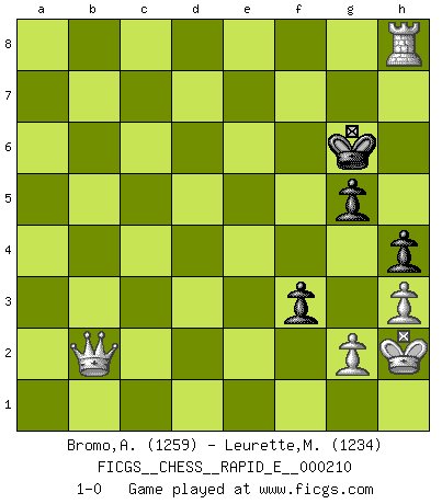 Last move : 1-0 2018 May 22 11:50:58 [Event "FICGS__CHESS__RAPID_E__000210"] [Site "FICGS"] [Date "2018.05.15"] [Round "1"] [White "Bromo,Alexis"] [Black "Leurette,Marc-Antoine"] [Result "1-0"] [WhiteElo "1259"] [BlackElo "1234"] 1.d4 d5 2.c4 e6 3.a3 Nf6 4.Nc3 Be7 5.Bf4 O-O 6.e3 c5 7.Nf3 b6 8.Be2 cxd4 9.Nxd4 Bd6 10.Bxd6 Qxd6 11.Ncb5 Qd8 12.h3 a6 13.Nc3 Bb7 14.Rc1 Nc6 15.O-O Ne5 16.Re1 dxc4 17.f4 Nc6 18.Bxc4 Nxd4 19.exd4 b5 20.Bb3 Bd5 21.Nxd5 Nxd5 22.Bxd5 Qxd5 23.Re5 Qd6 24.d5 exd5 25.Qf3 d4 26.Rc6 Qd7 27.b4 Rfc8 28.Rxc8+ Rxc8 29.Rd5 Qe6 30.Rxd4 g6 31.Re4 Qb6+ 32.Kh2 f5 33.Qb3+ Kh8 34.Re6 Qc7 35.Rxa6 Qxf4+ 36.Qg3 Qxg3+ 37.Kxg3 Rc3+ 38.Kh2 Rb3 39.Ra5 h5 40.Rxb5 Rxa3 41.Ra5 Rb3 42.b5 Kg7 43.Ra7+ Kh6 44.Rb7 h4 45.b6 Rb2 46.Rb8 g5 47.b7 f4 48.Rh8+ Kg6 49.b8Q f3 50.Qxb2 1-0 Queen's gambit declined Kingside Castling by player Black (move 5) Kingside Castling by player White (move 15) 10 pieces endgame at move 40 : White KRPPP , Black KRPPP WHITE : King + 1 Rook 3 Pawns BLACK : King + 1 Rook 3 Pawns Promotion Queen by player White (move 49) 9 pieces endgame at move 50 : White KQRPP , Black KPPP WHITE : King + 1 Queen 1 Rook 2 Pawns BLACK : King + 3 Pawns Player White won this chess game. Follow this game move after move (download)The battle for the ultimate truth will never be won. And that's why Chess is so fascinating. (Hans Kmoch) Auf jeden Fall musst du zuerst Rechtsanwalt werden, damit du deine eigenen Interessen und die deiner Familie vertreten kannst. [Brief an seinen Sohn] (José Raúl Capablanca) El Ajedrez es imaginación. (David Bronstein) Un millionnaire : 'Monsieur Steinitz ! Vous ne participez aux tournois que pour l'argent, alors que moi je n'y viens que pour l'honneur.' Steinitz : 'Chacun joue pour ce qu'il n'a pas'... Wipe them out. All of them. (Darth Sidious in Star Wars ep.1)