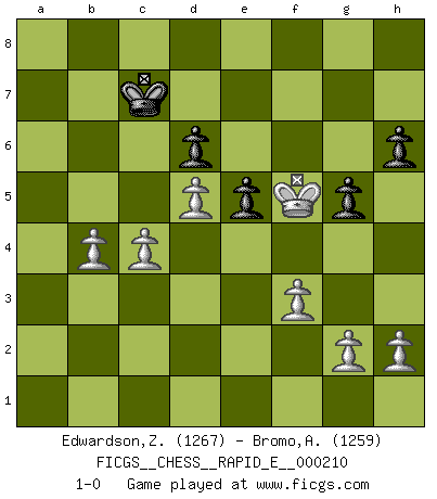 Last move : 1-0 2018 July 29 13:48:53 [Event "FICGS__CHESS__RAPID_E__000210"] [Site "FICGS"] [Date "2018.05.15"] [Round "1"] [White "Edwardson,Zachariah"] [Black "Bromo,Alexis"] [Result "1-0"] [WhiteElo "1267"] [BlackElo "1259"] 1.e4 e5 2.Nf3 Nc6 3.Bb5 d6 4.d4 h6 5.dxe5 dxe5 6.Qxd8+ Kxd8 7.Bxc6 bxc6 8.Nxe5 Be6 9.Nxc6+ Kc8 10.Be3 Ne7 11.Nxa7+ Kb7 12.Nb5 Rxa2 13.Rxa2 Bxa2 14.N1c3 Bc4 15.b3 Bxb5 16.Nxb5 Nc6 17.Ke2 Bb4 18.c3 Be7 19.Rd1 Rd8 20.Rd5 Rxd5 21.exd5 Ne5 22.Bd4 f6 23.Bxe5 fxe5 24.Kd3 Bc5 25.f3 Kb6 26.c4 g5 27.Ke4 Bd6 28.Nxd6 cxd6 29.b4 Kc7 30.Kf5 1-0 Ruy Lopez : Old Steinitz defense Player White won this chess game. Follow this game move after move (download)All I want to do, ever, is just play Chess. (Bobby Fischer) Wenn Dein Gegner dir ein Remis anbietet, versuch herauszufinden, weshalb er glaubt schlechter zu stehen. (Nigel Short) El Ajedrez es el arte del análisis. (Mikhail Botvinnik) Le joueur d'Echecs qui veut atteindre le top est obligé de développer son propre credo créatif. Alexeï Stepanovicth Souétine. Il est facile d'écrire des livres ! Ce qui est difficile, c'est de jouer ! (Alexeï Stepanovicth Souétine) I live to kill Traxler counterattack. (Ilmars Cirulis)