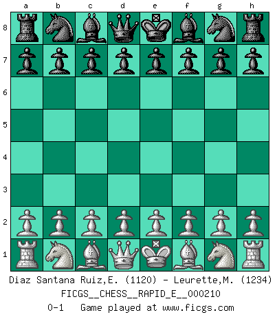 Last move : 0-1 2018 June 15 2:50:44 [Event "FICGS__CHESS__RAPID_E__000210"] [Site "FICGS"] [Date "2018.05.15"] [Round "1"] [White "Diaz Santana Ruiz,Enrique"] [Black "Leurette,Marc-Antoine"] [Result "0-1"] [WhiteElo "1120"] [BlackElo "1234"] 0-1 This chess game has been lost on time (started : 2018.05.15 22:54:44) Player Black won this chess game. Follow this game move after move (download)In the perfect Chess combination as in a first-rate short story, the whole plot and counter-plot should lead up to a striking finale, the interest not being allayed until the very last moment. (Yates and Winter) Es ist nicht das erste mal, dass sich die FIDE dem Arabischen Geld gebeugt hat (über die FIDE WM 2004 in Lybien). (Larry Evans) Por esta medida (el intervalo entre Fischer y sus contemporaneos), yo le considero el mas grande campeón mundial. (Garry Kasparov) RxDa4 pat (...) He is a liar. I just don't know what the lie is yet. (Horatio Caine, C.S.I. Miami)