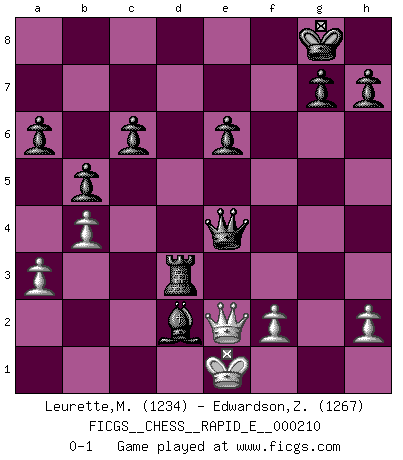 Last move : 0-1 2018 July 7 8:30:2 [Event "FICGS__CHESS__RAPID_E__000210"] [Site "FICGS"] [Date "2018.05.15"] [Round "1"] [White "Leurette,Marc-Antoine"] [Black "Edwardson,Zachariah"] [Result "0-1"] [WhiteElo "1234"] [BlackElo "1267"] 1.e4 c5 2.d4 cxd4 3.c3 dxc3 4.Nxc3 e6 5.Nf3 Nc6 6.Bb5 Nge7 7.O-O a6 8.Bxc6 Nxc6 9.a3 Be7 10.b4 O-O 11.Re1 b5 12.e5 f6 13.exf6 Bxf6 14.Bd2 Bb7 15.Re3 Rc8 16.Ne4 Bxa1 17.Nd6 Nd4 18.Nxc8 Nxf3+ 19.Rxf3 Bxf3 20.gxf3 Be5 21.Na7 Qh4 22.Kf1 Qh3+ 23.Ke1 Rxf3 24.Nc6 dxc6 25.Be3 Bc3+ 26.Bd2 Rd3 27.Ke2 Qf3+ 28.Ke1 Qe4+ 29.Qe2 Bxd2+ 0-1 Sicilian : Smith-Morra gambit Kingside Castling by player White (move 7) Kingside Castling by player Black (move 10) Player Black won this chess game. Follow this game move after move (download)The combination player thinks forward; he starts from the given position, and tries the forceful moves in his mind. (Emanuel Lasker) In der Schule lernt man nichts. Es ist nur Zeitverschwendung. (Robert James Fischer) Estaba muy claro de que el punto vulnerable del Gran Maestro Americano (Bobby Fischer) radicaba en las posiciones de doble filo, colgantes, irracionales, donde el siempre falló en encontrar un triunfo aún en una posición de clara victoria. (Efim Geller) La guerre est enfant de la passion, la passion est enfant du narcissisme et le narcissisme est l'enfant. (...) Une autre partie ? (Thibault de Vassal) When a man with money meets a man with experience, the man with experience leaves with money and the man with money leaves with experience. (Anonymous)