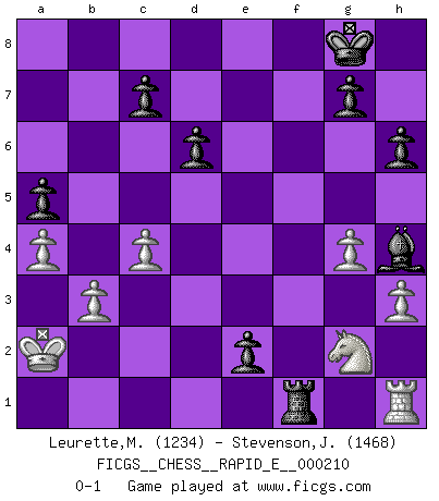 Last move : 0-1 2018 May 28 20:45:41 [Event "FICGS__CHESS__RAPID_E__000210"] [Site "FICGS"] [Date "2018.05.15"] [Round "1"] [White "Leurette,Marc-Antoine"] [Black "Stevenson,Jack"] [Result "0-1"] [WhiteElo "1234"] [BlackElo "1468"] 1.e4 e5 2.Nf3 Nc6 3.Bc4 Bc5 4.d3 Nf6 5.Bg5 d6 6.Nc3 h6 7.Bxf6 Qxf6 8.Nd5 Qd8 9.Qe2 Ne7 10.Nxe7 Qxe7 11.O-O-O Bg4 12.h3 Be6 13.Bxe6 Qxe6 14.c4 b5 15.Kb1 bxc4 16.dxc4 a5 17.a4 Rb8 18.Ka2 O-O 19.b3 f5 20.Rdf1 Qg6 21.exf5 Qxf5 22.Nh4 Qf6 23.g3 Qxf2 24.Rxf2 Rxf2 25.Qxf2 Bxf2 26.Rf1 Rf8 27.Ng2 e4 28.g4 e3 29.Ne1 e2 30.Rh1 Bh4 31.Ng2 Rf1 0-1 Giuoco Pianissimo Queenside Castling by player White (move 11) Kingside Castling by player Black (move 18) Player Black won this chess game. Follow this game move after move (download)Chess is above all, a fight ! (Emanuel Lasker) Immer nach dem besten Zug zu suchen ist ziemlich unpraktisch. (Nigel Short) Un buen sacrificio es aquel que aunque no sea necesariamente sólido, deja a tu oponente aturdido y confuso. (Rudolph Spielmann) Seul un grand joueur sait à quel point il joue faiblement. (Xavier Tartacover) A belief is an idea the mind possesses, an idea that possesses the mind. (Robert Oxden Bolton)