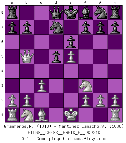 Last move : 0-1 2018 July 1 17:21:36 [Event "FICGS__CHESS__RAPID_E__000210"] [Site "FICGS"] [Date "2018.05.15"] [Round "1"] [White "Grammenos,Nikos"] [Black "Martinez Camacho,Victor Hugo"] [Result "0-1"] [WhiteElo "1019"] [BlackElo "1006"] 1.e4 c6 2.d4 d5 3.e5 Bf5 4.Bd3 Bxd3 5.Qxd3 e6 6.c3 Nd7 7.Nf3 c5 8.dxc5 Nxc5 9.Qb5+ Nd7 0-1 This chess game has been lost on time (started : 2018.05.15 22:54:44) Caro-Kann : Advance variation Player Black won this chess game. Follow this game move after move (download)Chess is a cold bath for the mind. (Sir John Simon) Rubinstein ist ein Turmendspiel, welches die Götter vor tausenden von Jahren begannen. (Savielly Grigorievitsch Tartakower) El Ajedrez es el juego mas altamente simbólico, pero las agresiones estan por lo tanto aún mas francamente representadas en la partida. Tal vez comenzo como un juego de guerra; Algo como la representación de una batalla en miniatura entre las fuerzas de dos reinos. (Karl Meninger) Le temps de noter son nom sur la feuille de partie, j'étais déjà en zeitnot ! D'un modeste amateur apparié lors de la première ronde d'un open contre le grand-maître Azmaïparashvili. Mandala - that's it! 16x16 squares as multiple of the four and the eight because of the Four Noble Truths and the Noble Eightfold Path. (Heinz-Georg Lehnhoff about Big Chess)