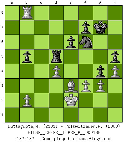 Last move : 1/2-1/2 2019 March 27 7:23:13 [Event "FICGS__CHESS__CLASS_A__000188"] [Site "FICGS"] [Date "2018.05.18"] [Round "1"] [White "Duttagupta,Aniruddha"] [Black "Polkwitzauer,Ardiantez"] [Result "1/2-1/2"] [WhiteElo "2101"] [BlackElo "2000"] 1.d4 Nf6 2.c4 e6 3.g3 d5 4.Nf3 Bb4+ 5.Bd2 Be7 6.Bg2 O-O 7.O-O c6 8.Qc2 b6 9.Bf4 Nbd7 10.Rd1 Ba6 11.Ne5 Rc8 12.cxd5 Nxd5 13.Nxc6 Nb4 14.Qa4 Nxc6 15.Bxc6 Bxe2 16.Rc1 Nb8 17.Bg2 Rxc1+ 18.Bxc1 Qd7 19.Qxd7 Nxd7 20.Nc3 Bc4 21.Be3 Nf6 22.Rc1 Rd8 23.Ne4 Bxa2 24.Rc7 Bd5 25.Rxe7 Bxe4 26.Bxe4 Nxe4 27.Rxa7 h6 28.Ra6 b5 29.Kf1 g5 30.Ke2 Nf6 31.Ra5 Rd5 32.f3 h5 33.h4 g4 34.Ra8+ Kg7 35.Rb8 1/2-1/2 Catalan Opening Kingside Castling by player Black (move 6) Kingside Castling by player White (move 7) This chess game ended in a draw. Follow this game move after move (download)Chess is 99 percent tactics. (Teichmann) Es war undenkbar für die Behörden, dass ein sowjetischer Großmeister auf diese Art und Weise [Fischer-Taimanov 6:0] verliert, ohne dass es eine politischer Erklärung dafür gäbe. (Mark Taimanov) El Ajedrez es un juego terrible. Si no dominas el centro, tu oponente tiene una posición mas libre. Si tu tienes el centro, entonces realmente tienes algo de que preocuparte. (Siegbert Tarrasch) Je menace de comprendre la position. (Anonyme) In every real man a child is hidden that wants to play. (Friedrich Nietzsche)