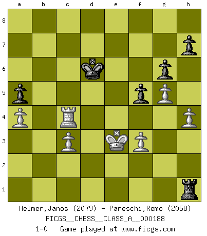 Last move : 1-0 2018 December 30 3:43:52 [Event "FICGS__CHESS__CLASS_A__000188"] [Site "FICGS"] [Date "2018.05.18"] [Round "1"] [White "Helmer,Janos"] [Black "Pareschi,Remo"] [Result "1-0"] [WhiteElo "2079"] [BlackElo "2058"] 1.Nf3 d5 2.d4 e6 3.Bf4 c5 4.e3 Nc6 5.c3 Bd6 6.Bg3 Nf6 7.Nbd2 O-O 8.Bd3 b6 9.e4 Be7 10.dxc5 bxc5 11.O-O g6 12.Re1 Nh5 13.exd5 exd5 14.Bb5 Na5 15.Qe2 Nxg3 16.Qxe7 Ne4 17.Qxd8 Rxd8 18.Nxe4 dxe4 19.Rxe4 Rb8 20.a4 a6 21.Bf1 Bb7 22.Re3 Bxf3 23.Rxf3 Nb3 24.Re1 Nd2 25.Rd3 Rxd3 26.Bxd3 c4 27.Bf1 Nxf1 28.Kxf1 Rxb2 29.Re4 Ra2 30.Rxc4 Kf8 31.g4 Ke7 32.Kg2 Kd6 33.g5 a5 34.Kf3 f6 35.h4 f5 36.Ke3 Ra1 37.f3 Re1+ 38.Kf4 Rh1 39.Ke3 1-0 This chess game has been lost on time (started : 2018.05.18 3:31:51) Reti Opening Kingside Castling by player Black (move 7) Kingside Castling by player White (move 11) Player White won this chess game. Follow this game move after move (download)Chess is like life. (Boris Spassky) Ja, ich habe einmal eine Blitzpartie gespielt, es war in einem Zug, 1929. --im Interview 1989 (Mikhail Moiseyevich Botvinik) Dejen al perfeccionista jugar por correo. (Yasser Seirawan) Les échecs, c'est l'art d'analyser. (Mikhail Botvinnik) All politicians must be presumed guilty until they are proven innocent. (Dinesh De Silva)