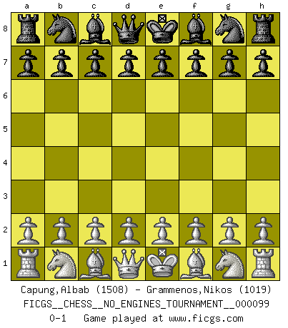 Last move : 0-1 2018 June 27 16:11:21 [Event "FICGS__CHESS__NO_ENGINES_TOURNAMENT__000099"] [Site "FICGS"] [Date "2018.05.18"] [Round "1"] [White "Capung,Albab"] [Black "Grammenos,Nikos"] [Result "0-1"] [WhiteElo "1508"] [BlackElo "1019"] 0-1 This chess game has been lost on time (started : 2018.05.18 13:49:10) Player Black won this chess game. Follow this game move after move (download)Every Chess master was once a beginner. (Chernev) Ja, jede Frau in Holland liebt mich bestimmt, und alle Männer hassen mich. (Loek van Wely) Puntos débiles o agujeros en la posición de tu oponente deben de ser ocupados por piezas, no Peones. (Siegbert Tarrasch) On peut tirer plus d'utilité d'une partie perdue que de 100 parties gagnées. (Capablanca) I have opinions of my own - strong opinions - but I don't always agree with them. (George Bush)