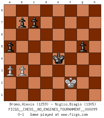Last move : 0-1 2018 December 8 17:52:26 [Event "FICGS__CHESS__NO_ENGINES_TOURNAMENT__000099"] [Site "FICGS"] [Date "2018.05.18"] [Round "1"] [White "Bromo,Alexis"] [Black "Niglio,Biagio"] [Result "0-1"] [WhiteElo "1259"] [BlackElo "1305"] 1.d4 d5 2.c4 e5 3.Nc3 dxc4 4.e3 exd4 5.exd4 Nf6 6.Bxc4 Be7 7.Qf3 Qxd4 8.Be2 Nc6 9.Be3 Qb4 10.Rb1 Bg4 11.Qf4 Qxf4 12.Bxf4 Bxe2 13.Ngxe2 O-O-O 14.f3 Bd6 15.Bg5 Be7 16.O-O h6 17.Bh4 g5 18.Bg3 Rhe8 19.Kh1 Bd6 20.Rfd1 Bxg3 21.hxg3 Rxd1+ 22.Rxd1 Rd8 23.Rxd8+ Kxd8 24.g4 Kd7 25.f4 Nxg4 26.fxg5 hxg5 27.Ne4 f6 28.N2g3 Nb4 29.a3 Nd3 30.b3 Ndf2+ 31.Nxf2 Nxf2+ 32.Kg1 Nd3 33.Kf1 a5 34.Ne4 Ke7 35.g4 Ne5 36.Nf2 Ke6 37.Ke2 f5 38.gxf5+ Kxf5 39.Ke3 Ng4+ 40.Kf3 Nxf2 41.Kxf2 Ke4 0-1 QGD : Albin counter-gambit Queenside Castling by player Black (move 13) Kingside Castling by player White (move 16) 10 pieces endgame at move 38 : White KNPP , Black KNPPPP WHITE : King + 1 Knight 2 Pawns BLACK : King + 1 Knight 4 Pawns 9 pieces endgame at move 40 : White KPP , Black KNPPPP WHITE : King + 2 Pawns BLACK : King + 1 Knight 4 Pawns 8 pieces endgame at move 41 : White KPP , Black KPPPP WHITE : King + 2 Pawns BLACK : King + 4 Pawns Player Black won this chess game. Follow this game move after move (download)There are two types of sacrifices: correct ones and mine. (Mikhail Tal) Wenn sie aufgeben, dann danke ich Ihnen für das Spiel (Eventualzug beim Fernschach). (Anonymous) La pasion por jugar al Ajedrez es una de las mas inexplicables en el mundo. (H.G. Wells) Les échecs sont plus proches de l'art de l'assassinat que de l'art de la guerre. (Arturo Perez-Reverte) Watch your thoughts; they become words. Watch your words; they become actions. Watch your actions; they become habits. Watch your habits; they become character. Watch your character; it becomes your destiny. (Frank Outlaw)