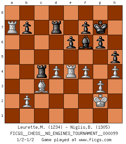 Last move : 1/2-1/2 2018 July 18 11:42:36 [Event "FICGS__CHESS__NO_ENGINES_TOURNAMENT__000099"] [Site "FICGS"] [Date "2018.05.18"] [Round "1"] [White "Leurette,Marc-Antoine"] [Black "Niglio,Biagio"] [Result "1/2-1/2"] [WhiteElo "1234"] [BlackElo "1305"] 1.e4 c6 2.d4 d5 3.Nc3 dxe4 4.Nxe4 Bf5 5.Nc3 e6 6.Nf3 Nd7 7.Bd3 Bxd3 8.Qxd3 Ngf6 9.O-O Bd6 10.Re1 O-O 11.Bg5 Qc7 12.Ne4 Nxe4 13.Qxe4 h6 14.Bd2 Nf6 15.Qd3 Rad8 16.g3 c5 17.c3 cxd4 18.cxd4 Qb6 19.Bc3 Rd7 20.a3 Rc8 21.Rab1 Qb3 22.Nd2 Qd5 23.Ne4 Nxe4 24.Qxe4 Qxe4 25.Rxe4 Bxa3 26.Ra1 Be7 27.Rxa7 Bf6 28.Kg2 Kf8 29.f4 g6 30.h4 Rc4 31.Ra8+ Kg7 32.Ra7 h5 1/2-1/2 Caro-Kann : Classical variation Kingside Castling by player White (move 9) Kingside Castling by player Black (move 10) This chess game ended in a draw. Follow this game move after move (download)When your house is on fire, you can't be bothered with the neighbors. Or, as we say in Chess, if your King is under attack you don't worry about losing a Pawn on the Queen's side. (Gary Kasparov) Je mehr ich von der FIDE weiss, um so weniger verstehe ich. (Alexander Kalifman) El Peón aislado arroja penumbra sobre todo el tablero. (Aaron Nimzovich) En blitz, le Cavalier l'emporte sur le Fou. (Vlastimil Hort) My poor ole parrot... Is not in the circulation of displays ....poo hoo hoo :) (Wayne Lowrance's enigma)