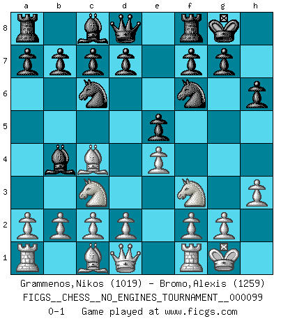 Last move : 0-1 2018 July 9 19:8:0 [Event "FICGS__CHESS__NO_ENGINES_TOURNAMENT__000099"] [Site "FICGS"] [Date "2018.05.18"] [Round "1"] [White "Grammenos,Nikos"] [Black "Bromo,Alexis"] [Result "0-1"] [WhiteElo "1019"] [BlackElo "1259"] 1.e4 e5 2.Nf3 Nc6 3.Bc4 h6 4.Nc3 Nf6 5.O-O Bb4 6.h3 O-O 0-1 This chess game has been lost on time (started : 2018.05.18 13:49:10) King's pawn game Kingside Castling by player White (move 5) Kingside Castling by player Black (move 6) Player Black won this chess game. Follow this game move after move (download)Daring ideas are like Chess men moved forward. They may be beaten, but they may start a winning game. (Johann Wolfgang von Goethe) Die Fehler sind da, Sie warten nur darauf gemacht zu werden. (Savielly Grigorievitsch Tartakower) Yo he agregado estos principios a la ley: pongan los Caballos en acción antes de que los dos Alfiles sean desarrollados. (Emanuel Lasker) Soyez une menace à chaque fois que vous vous asseyez pour jouer. (Ken Smith) I couldn't make any sense out of what this particular thread is about. It sounds like R2 D2 computer speaking. A space fight ?!? Some 'command' problems in Moscow ? Some killers & narcotic addicts attacking some game & a god wannabe ?? (Dinesh De Silva, lost in a russian conflict in FICGS forum)