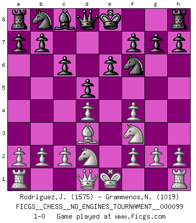 Last move : 1-0 2018 June 29 17:6:37 [Event "FICGS__CHESS__NO_ENGINES_TOURNAMENT__000099"] [Site "FICGS"] [Date "2018.05.18"] [Round "1"] [White "Rodriguez,Juan Antonio"] [Black "Grammenos,Nikos"] [Result "1-0"] [WhiteElo "1575"] [BlackElo "1019"] 1.d4 d5 2.Bf4 e6 3.e3 Bd6 4.Nf3 Bxf4 5.exf4 Nf6 6.Bd3 c6 7.Nbd2 1-0 This chess game has been lost on time (started : 2018.05.18 13:49:10) Queen's pawn, Mason variation Player White won this chess game. Follow this game move after move (download)I know people who have all the will in the world, but still can't play good Chess. (Bobby Fischer) Ich moechte nie einem Club beitreten, der Leute wie mich als Mitglieder aufnimmt. (Woody Allen) Cuando veas una buena jugada, trata de encontrar otra mejor. (Emanuel Lasker) Comme les marins qui ont mille raisons différentes d'aller en mer, les joueurs d'échecs en ont tout autant avant de s'installer devant une table et jouer... (Vincent Bertignac, philosophe) Art disturbs, science reassures. (Georges Braque, Le Jour et la Nuit)