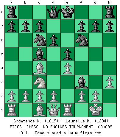 Last move : 0-1 2018 June 28 4:56:26 [Event "FICGS__CHESS__NO_ENGINES_TOURNAMENT__000099"] [Site "FICGS"] [Date "2018.05.18"] [Round "1"] [White "Grammenos,Nikos"] [Black "Leurette,Marc-Antoine"] [Result "0-1"] [WhiteElo "1019"] [BlackElo "1234"] 1.e4 e5 2.Nf3 Nc6 3.Bc4 Nf6 4.Nc3 Bc5 5.O-O d6 6.Re1 Bg4 7.h3 Bxf3 0-1 This chess game has been lost on time (started : 2018.05.18 13:49:10) Two knights defense Kingside Castling by player White (move 5) Player Black won this chess game. Follow this game move after move (download)Chess is like war on a board. (Bobby Fischer) Ich kämpfe solange mein Gegner einen Fehler machen kann. (Emanuel Lasker) El Ajedrez es realmente noventa y nueve por ciento calculación. (Soltis) Des combinaisons [dans le jeu d'échecs] pareilles à des mélodies. Je crois entendre pour ainsi dire la musique des coups... (Vladimir Nabokov) The various flowers seem good to different people. (Chinese proverb)