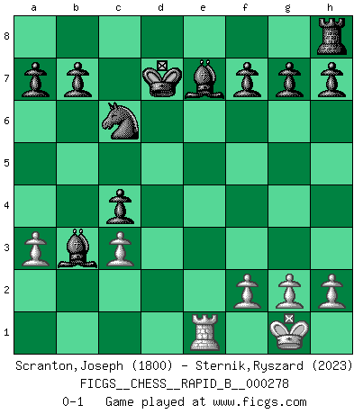 Last move : 0-1 2018 June 12 6:9:14 [Event "FICGS__CHESS__RAPID_B__000278"] [Site "FICGS"] [Date "2018.05.19"] [Round "1"] [White "Scranton,Joseph"] [Black "Sternik,Ryszard"] [Result "0-1"] [WhiteElo "1800"] [BlackElo "2023"] 1.e4 c5 2.Nc3 Nc6 3.Nf3 e6 4.Bc4 Nf6 5.O-O d5 6.exd5 exd5 7.Nxd5 Nxd5 8.Ne5 Nxe5 9.Re1 Be6 10.d3 Nxc4 11.dxc4 Nb4 12.c3 Qxd1 13.Rxd1 Nc6 14.Bf4 Bxc4 15.Re1+ Be6 16.Rad1 Be7 17.a3 Rd8 18.Bd2 Bb3 19.Rc1 Rxd2 20.Rf1 Rxb2 21.Rb1 Rxb1 22.Rxb1 c4 23.Re1 Kd7 0-1 Sicilian : Closed, 2...Nc6 Kingside Castling by player White (move 5) Player Black won this chess game. Follow this game move after move (download)First-class players lose to second class players because second-class players sometimes play a first-class game. (Tarrasch) Ich bin Weltmeister und muß mit niemandem irgend etwas diskutieren. (Viswanathan Anand) Repentinamente, me resultaba obvio en mi analisis que yo había pasado por alto lo que Fischer había visto en el tablero con la mas grande facilidad. (Mikhail Botvinnik) Il a essayé de se convaincre qu'il pourrait empêcher toutes les erreurs et ne jamais perdre. L'horreur ! Gary Kasparov au sujet de Robert Fischer. If we don't succeed, we run the risk of failure. (George W. Bush)