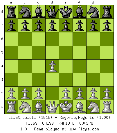 Last move : 1-0 2018 July 30 8:46:10 [Event "FICGS__CHESS__RAPID_B__000278"] [Site "FICGS"] [Date "2018.06.30"] [Round "1"] [White "Liwat,Lowell"] [Black "Rogerio,Rogerio"] [Result "1-0"] [WhiteElo "1818"] [BlackElo "1700"] 1.d4 1-0 This chess game has been lost on time (started : 2018.06.30 0:15:22) Queen's pawn Player White won this chess game. Follow this game move after move (download)Bobby Fischer is the greatest Chess player who has ever lived. (Ken Smith) Wenn Du nicht kämpfst, um anderen etwas zu beweisen, sondern nur für Dich selbst, dann bist du fast unbesiegbar. (Garry Kasparov) Alguna parte de un error es siempre correcto. (Savielly Tartakover) Même un GMI sait rarement calculer sur plus de cinq coups une attaque à sacrifices. (Rudolf Spielmann) Now be brave and don't look back. Don't look back. (Shmi Skywalker in Star Wars ep.1)