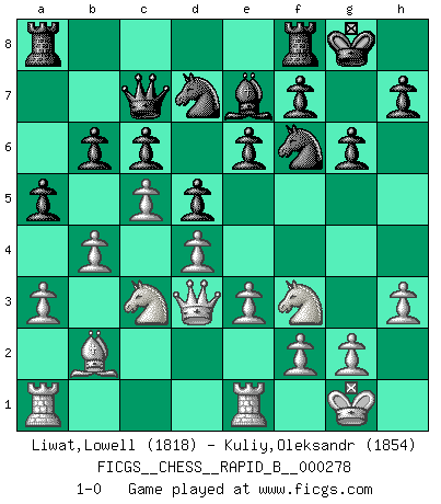 Last move : 1-0 2018 July 4 5:47:43 [Event "FICGS__CHESS__RAPID_B__000278"] [Site "FICGS"] [Date "2018.05.19"] [Round "1"] [White "Liwat,Lowell"] [Black "Kuliy,Oleksandr"] [Result "1-0"] [WhiteElo "1818"] [BlackElo "1854"] 1.d4 d5 2.c4 c6 3.e3 e6 4.Nc3 Nf6 5.a3 Nbd7 6.c5 b6 7.b4 a5 8.Bb2 Be7 9.Nf3 Qc7 10.Bd3 Ba6 11.O-O O-O 12.Re1 Bxd3 13.Qxd3 g6 14.h3 1-0 This chess game has been lost on time (started : 2018.05.19 20:39:26) QGD Slav defense Kingside Castling by player White (move 11) Kingside Castling by player Black (move 11) Player White won this chess game. Follow this game move after move (download)Becoming successful at Chess allows you to discover your own personality. That's what I want for the kids I teach. (Saudin Robovic) Ein Isolani verdüstert die Stimmung auf dem ganzen Schachbrett. (Savielly Grigorievitsch Tartakower) Nada excita más a Grandes Maestros aburridos que una novedad teórica. (Dominic Lawson) Dans le domaine de la peinture, de la gravure et de la sculpture, dès la première décennie de notre siècle, les artistes abandonnent la représentation de la partie d'échecs pour se concentrer sur les pièces, sur les échiquiers et sur toutes les variations auxquelles les unes et les autres peuvent donner lieu. On passe en quelque sorte d'un thème social à un thème musical (au sens de la musica médiévale, c'est-à-dire d'une notion qui inclue le rythme, l'harmonie, la construction et la déconstruction, etc.). Graphiquement et picturalement, l'échiquier apparaît comme une structure ouverte, dynamique, d'une richesse infinie, autorisant toutes les combinatoires et débouchant sur des mouvements et des rythmes de nature exponentielle. (Michel Pastoureau) An expert is a man who has made all the mistakes which can be made in a very narrow field. (Niels Bohr)