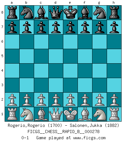 Last move : 0-1 2018 July 30 8:46:10 [Event "FICGS__CHESS__RAPID_B__000278"] [Site "FICGS"] [Date "2018.06.30"] [Round "1"] [White "Rogerio,Rogerio"] [Black "Salonen,Jukka"] [Result "0-1"] [WhiteElo "1700"] [BlackElo "1882"] 0-1 This chess game has been lost on time (started : 2018.06.30 0:15:22) Player Black won this chess game. Follow this game move after move (download)Spassky will not be psyched out by Fischer. (Mike Goodall) Die Leute spielen gegen mich seit 15 Jahren unter Ihren Möglichkeiten. (Robert James Fischer) En el tablero, la mentira e hipocresía no sobreviven mucho. (Emanuel Lasker) Les échecs, c'est l'imagination. (David Bronstein) Computer Science is no more about computers than astronomy is about telescopes. (Edsger W. Dijkstra)