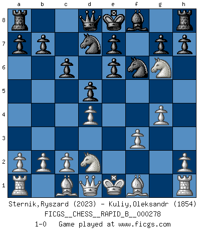 Last move : 1-0 2018 July 4 17:48:29 [Event "FICGS__CHESS__RAPID_B__000278"] [Site "FICGS"] [Date "2018.05.19"] [Round "1"] [White "Sternik,Ryszard"] [Black "Kuliy,Oleksandr"] [Result "1-0"] [WhiteElo "2023"] [BlackElo "1854"] 1.e4 c6 2.d4 d5 3.e5 Bf5 4.Nf3 Nd7 5.Nh4 Be4 6.e6 fxe6 7.Nd2 Ngf6 8.f3 Bf5 9.g4 Bg6 10.Nxg6 1-0 This chess game has been lost on time (started : 2018.05.19 20:39:26) Caro-Kann : Advance variation Player White won this chess game. Follow this game move after move (download)The older I grow, the more I value Pawns. (Keres) Ich spiele 70 Eröffnungssysteme. (Viktor Kortschnoi) ¿Esta Bobby Fischer algo cuerdo?. (Salo Flohr) Le jeu d'échecs est comme rejeté hors du temps. (Antoine de Saint-Exupéry) Nothing is more important for teaching us to understand the concepts we have than constructing fictitious ones. (Ludwig Wittgenstein)