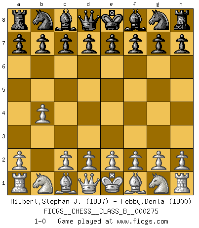 Last move : 1-0 2018 July 9 7:5:1 [Event "FICGS__CHESS__CLASS_B__000275"] [Site "FICGS"] [Date "2018.05.19"] [Round "1"] [White "Hilbert,Stephan J."] [Black "Febby,Denta"] [Result "1-0"] [WhiteElo "1837"] [BlackElo "1800"] 1.b4 1-0 This chess game has been lost on time (started : 2018.05.19 23:43:37) Polish (Sokolsky) opening Player White won this chess game. Follow this game move after move (download)I like to say that Bobby Fischer was the greatest player ever. But what made Fischer a genius was his ability to blend an American freshness and pragmatism with Russian ideas about strategy. (Bruce Pandolfini) Das typische an einem Großmeister ist, daß er eine gewonnene Position schnell und schmerzlos gewinnt. (Irving Chernev) El Ajedrez era la lengua materna de Capablanca. (Reti) Il s'avisa de me proposer d'apprendre les échecs qu'il jouait un peu... me voilà forcené des échecs. J'achète un échiquier, je m'enferme dans ma chambre, j'y passe des jours et des nuits à vouloir apprendre par cur toutes les parties. (Jean-Jacques Rousseau, Confessions) Coffee just isn't my cup of tea. (Unknown)