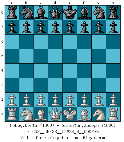 Last move : 0-1 2018 June 29 4:56:39 [Event "FICGS__CHESS__CLASS_B__000275"] [Site "FICGS"] [Date "2018.05.19"] [Round "1"] [White "Febby,Denta"] [Black "Scranton,Joseph"] [Result "0-1"] [WhiteElo "1800"] [BlackElo "1800"] 0-1 This chess game has been lost on time (started : 2018.05.19 23:43:37) Player Black won this chess game. Follow this game move after move (download)All that matters on the Chessboard is good moves. (Bobby Fischer) Fischer ist das größte Genie, das je vom Schachhimmel heruntergestiegen ist. (Mikhail Nekhemyevich Tal) Cuando tengas duda... ¡juega al Ajedrez!. (Tevis) Les échecs c'est le défi de l'alpiniste, toujours plus haut, prêt à tout pour monter à l'assaut du Roi ennemi. Les échecs, c'est de la musique en mouvement, un ballet majestueux pour les yeux. C'est de la poésie composée par les fantômes du passé qui au même titre que Rimbaud ou Verlaine méritent notre admiration. Les échecs, c'est de la peinture ou le moindre mouvement modifie le tableau pour en faire un Picasso ou un Van Gogh. Les échecs, c'est tout et rien, c'est la vie et la mort. Jjulie33 sur le forum de France-Echecs. All politicians must be presumed guilty until they are proven innocent. (Dinesh De Silva)