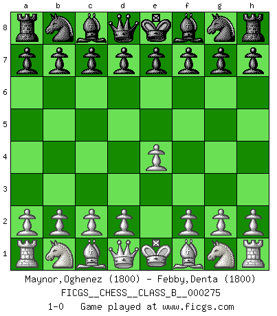 Last move : 1-0 2018 June 29 4:56:39 [Event "FICGS__CHESS__CLASS_B__000275"] [Site "FICGS"] [Date "2018.05.19"] [Round "1"] [White "Maynor,Oghenez"] [Black "Febby,Denta"] [Result "1-0"] [WhiteElo "1800"] [BlackElo "1800"] 1.e4 1-0 This chess game has been lost on time (started : 2018.05.19 23:43:37) King's pawn Opening Player White won this chess game. Follow this game move after move (download)When I have White, I win because I am white; When I have Black, I win because I am Bogolyubov. (Bogolyubov) Die Fehler sind da, Sie warten nur darauf gemacht zu werden. (Savielly Grigorievitsch Tartakower) No puedes jugar al Ajedrez si eres de corazón noble. (Proverbio Francés) Un journaliste : 'Vous préférez avoir une dame de plus sur l'échiquier ou au lit ?' Boris Spassky : 'Ca dépend de la position.' Tree pose grows confidence. It roots me to this world. (Terri Guillemets)