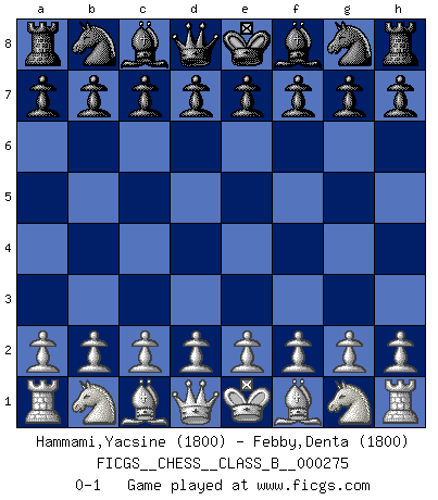 Last move : 0-1 2018 June 29 4:56:39 [Event "FICGS__CHESS__CLASS_B__000275"] [Site "FICGS"] [Date "2018.05.19"] [Round "1"] [White "Hammami,Yacsine"] [Black "Febby,Denta"] [Result "0-1"] [WhiteElo "1800"] [BlackElo "1800"] 0-1 This chess game has been lost on time (started : 2018.05.19 23:43:37) Player Black won this chess game. Follow this game move after move (download)When you don't know what to play, wait for an idea to come into your opponent's mind. You may be sure that idea will be wrong. (Siegbert Tarrasch) Der Verteidiger gebe der Gewalt nach, aber nur der Gewalt. Er schaffe sich nicht freiwillig, etwa aus Blindheit oder aus Schrecken, irgendwelche Schwächen. Er lasse sich nicht bluffen. (Emanuel Lasker) El juego del Ajedrez no es solamente una diversión quieta; algunas cualidades muy valuables de la mente se pueden adquirir y cultivar con el, como convertirlos en habitos disponibles para toda ocasión; ya que la vida es algo así como el Ajedrez. (Benjamin Franklin) Le pion, dans sa simplicité, marche droit devant lui, mais lorsqu'il prend, il le fait obliquement? Ainsi l'homme, tant qu'il reste pauvre, marche dans la droiture et vit honnêtement, mais lorsqu'il recherche les honneurs, il flatte, se parjure et, par les voies obliques, cherche une position supérieure sur l'échiquier du monde. (Jean de Galles) I find your interest interesting. (Gregory House, House M.D.)