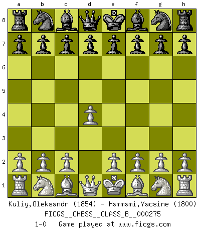 Last move : 1-0 2018 June 29 17:6:37 [Event "FICGS__CHESS__CLASS_B__000275"] [Site "FICGS"] [Date "2018.05.19"] [Round "1"] [White "Kuliy,Oleksandr"] [Black "Hammami,Yacsine"] [Result "1-0"] [WhiteElo "1854"] [BlackElo "1800"] 1.d4 1-0 This chess game has been lost on time (started : 2018.05.19 23:43:37) Queen's pawn Player White won this chess game. Follow this game move after move (download)Every Pawn is a potential Queen. (James Mason) Gewinnen beim Schach fördert das Selbstvertrauen. Beim Sex spüre ich sowas nicht... (Garry Kasparov) a manera como él juega al Ajedrez, demuestra la completa naturaleza de un hombre. (Stanley Ellin) On croit qu'il y a plus de mauvais joueurs que de bons joueurs, c'est faux : Il y a autant de joueurs qui gagnent que de joueurs qui perdent. (Philippe Geluck) All men can see these tactics whereby I conquer, but what none can see is the strategy out of which victory is evolved. (Sun Tzu)