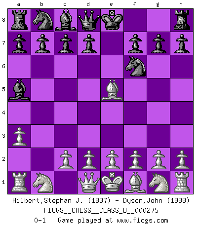 Last move : 0-1 2018 June 30 17:5:29 [Event "FICGS__CHESS__CLASS_B__000275"] [Site "FICGS"] [Date "2018.05.19"] [Round "1"] [White "Hilbert,Stephan J."] [Black "Dyson,John"] [Result "0-1"] [WhiteElo "1837"] [BlackElo "1988"] 1.b4 e5 2.Bb2 Bxb4 3.Bxe5 Nf6 4.a3 Ba5 0-1 This chess game has been lost on time (started : 2018.05.19 23:43:37) Polish (Sokolsky) opening Player Black won this chess game. Follow this game move after move (download)When the Chess game is over, the Pawn and the King go back to the same box. (Irish saying) Frage: Wie viele Autos haben Sie schon zerstört? - Antwort: Nur zwei. (Loek van Wely) Un entendimiento a fondo de las continuaciones típicas del mate, hace de las combinaciones de sacrificio mas complicadas conducirlas a ellas no solo sin dificultad, sino casi de una manera natural. (Siegbert Tarrasch) Je ne suis pas le dernier à jouer lâchement des coups douteux pendant le zeïtnot de l'adversaire pour l'achever: en effet les coups qui font le plus peur sont ceux que l'on ne comprend pas. Je me fais souvent peur quand je joue. (Un professeur anonyme) It is not enough to be a good player... you must also play well. (Siegbert Tarrasch)