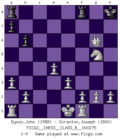 Last move : 1-0 2018 July 2 3:0:55 [Event "FICGS__CHESS__CLASS_B__000275"] [Site "FICGS"] [Date "2018.05.19"] [Round "1"] [White "Dyson,John"] [Black "Scranton,Joseph"] [Result "1-0"] [WhiteElo "1988"] [BlackElo "1800"] 1.Nf3 Nc6 2.c4 Nf6 3.d4 e6 4.Nc3 Bb4 5.Qc2 O-O 6.a3 Bxc3+ 7.Qxc3 b6 8.Bg5 h6 9.Bh4 Ne4 10.Qc2 d5 11.Bxd8 Rxd8 12.cxd5 exd5 13.Qxc6 Bd7 14.Qxc7 Bb5 15.e3 Bxf1 16.Rxf1 Rdc8 17.Qb7 f6 18.Qxd5+ Kh7 19.Qxe4+ g6 20.Qe7+ Kg8 21.Qxf6 Rf8 22.Qxg6+ Kh8 23.Qxh6+ Kg8 24.Qg6+ Kh8 25.Ng5 1-0 Reti Opening Kingside Castling by player Black (move 5) Player White won this chess game. Follow this game move after move (download)Fischer is under obligation to nobody. (Joseph Platz) Schachspieler können ausgezeichnet Varianten am Schachbrett berechnen, aber nicht im realen Leben. Zu stark ist der Individualismus im Schach ausgeprägt, und für viele ist ein kleiner momentaner persönlicher Vorteil wichtiger als ein weit größerer Vorteil von morgen. (Anatoly Karpov) No es una movida, aún la mejor movida que tu debas buscar, sino un plan comprensible. (Eugene Znosko-Borovsky) Si je n'étais pas joueur d'échecs, je serais le meilleur dans quelque chose d'autre. (Anatoli Karpov) A journey of a thousand sites begins with a single click. (Author unknown)