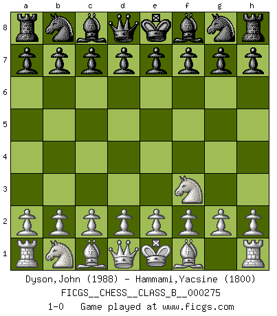 Last move : 1-0 2018 June 29 17:6:37 [Event "FICGS__CHESS__CLASS_B__000275"] [Site "FICGS"] [Date "2018.05.19"] [Round "1"] [White "Dyson,John"] [Black "Hammami,Yacsine"] [Result "1-0"] [WhiteElo "1988"] [BlackElo "1800"] 1.Nf3 1-0 This chess game has been lost on time (started : 2018.05.19 23:43:37) Reti Opening Player White won this chess game. Follow this game move after move (download)Every Chess master was once a beginner. (Chernev) Kostenjuk hat keinen Sexappeal. (Loek van Wely) El Ajedrez es el gimnasio de la mente. (Blaise Pascal) La conception d'un plan est le processus par lequel un joueur exploite les avantages de sa position tout en s'efforçant d'en réduire au minimum les inconvénients. Afin de garantir le succès, un plan doit toujours se fonder sur un diagnostic objectif des particularités d'une position. La conception d'un plan est d'autant plus difficile que la position est équilibrée, et grandement facilitée lorsqu'il n'existe qu'un seul plan susceptible de répondre aux exigences de la position. (Harry Golombek) There are two major products that came out of Berkeley: LSD and UNIX. We do not believe this is to be a coincidence. (Jeremy S. Anderson)