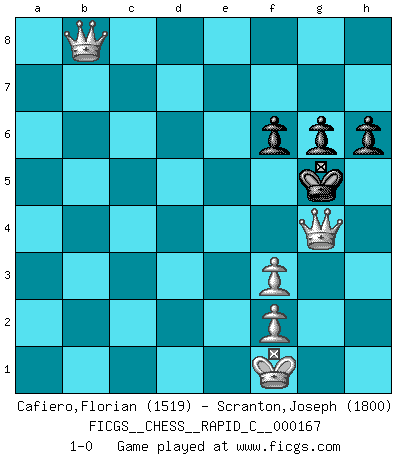 Last move : 1-0 2018 August 22 9:45:54 [Event "FICGS__CHESS__RAPID_C__000167"] [Site "FICGS"] [Date "2018.05.21"] [Round "1"] [White "Cafiero,Florian"] [Black "Scranton,Joseph"] [Result "1-0"] [WhiteElo "1519"] [BlackElo "1800"] 1.e4 Nc6 2.d4 Nf6 3.Nc3 Nxd4 4.Qxd4 e6 5.e5 Nd5 6.Nxd5 exd5 7.Qxd5 d6 8.Bc4 Be6 9.Qe4 d5 10.Bb5+ c6 11.Qa4 cxb5 12.Qxb5+ Qd7 13.Qxd7+ Bxd7 14.Be3 Bb4+ 15.c3 d4 16.Bxd4 Be7 17.Nf3 O-O 18.O-O Rac8 19.Bxa7 Bc5 20.Bxc5 Rxc5 21.Rfd1 Bg4 22.Re1 Bxf3 23.gxf3 Re8 24.Kg2 R8xe5 25.Rxe5 Rxe5 26.b4 Rg5+ 27.Kf1 Rh5 28.Rd1 g6 29.a4 Rxh2 30.a5 Kg7 31.b5 Rh5 32.c4 h6 33.a6 bxa6 34.bxa6 Ra5 35.Rd6 Rc5 36.a7 Rc8 37.c5 f6 38.Rd7+ Kf8 39.Rb7 Ra8 40.Rb8+ Rxb8 41.axb8Q+ Kf7 42.c6 Ke6 43.c7 Kf5 44.c8Q+ Kg5 45.Qg4+ 1-0 KP : Nimzovich defense Kingside Castling by player Black (move 17) Kingside Castling by player White (move 18) 10 pieces endgame at move 40 : White KPPPP , Black KRPPP WHITE : King + 4 Pawns BLACK : King + 1 Rook 3 Pawns Promotion Queen by player White (move 41) 9 pieces endgame at move 41 : White KQPPP , Black KPPP WHITE : King + 1 Queen 3 Pawns BLACK : King + 3 Pawns Promotion Queen by player White (move 44) Player White won this chess game. Follow this game move after move (download)Some sacrifices are sound; the rest are mine. (Mikhail Tal) Sie führen leise Selbstgespräche, schlürfen lautstark ihre Getränke, schmatzen hörbar beim Essen, blasen ihrem Gegenüber Rauch in die Augen, niesen ihm ins Gesicht, starren ihn unverwandt an, bis er sich unter ihren Blicken windet, rutschen ständig auf ihrem Stuhl hin und her, rülpsen und bohren in der Nase. (Anonymous) El Jaque al descubierto es el bombardero del tablero. (Reuben Fine) Les Echecs sont affaire de jugement sensible. Savoir quand frapper et quand esquiver. (Fischer) My poor ole parrot... Is not in the circulation of displays ....poo hoo hoo :) (Wayne Lowrance's enigma)