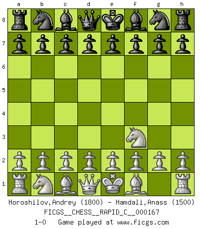 Last move : 1-0 2018 June 20 15:22:35 [Event "FICGS__CHESS__RAPID_C__000167"] [Site "FICGS"] [Date "2018.05.21"] [Round "1"] [White "Horoshilov,Andrey"] [Black "Hamdali,Anass"] [Result "1-0"] [WhiteElo "1800"] [BlackElo "1500"] 1.Nf3 1-0 This chess game has been lost on time (started : 2018.05.21 0:47:55) Reti Opening Player White won this chess game. Follow this game move after move (download)I play correspondence chess because it is both art and science while chess is art only. (A player at FICGS) Ich spiele 70 Eröffnungssysteme. (Viktor Kortschnoi) Fischer no está bajo la obligación de nadie. (Joseph Platz) Botvinnik disait en comparant les échecs à la musique: Il existe une science dont le but est l'étude de l'acoustique et des sons. Mais il y a aussi un art qui se sert de l'océan des sons : c'est la musique. De toute évidence, il en est de même pour la pensée. La logique est l'étude des lois de la réflexion et les échecs reflètent, en tant qu'art, le côté logique de la réflexion, sous la forme d'images artistiques... Extrait de Fischer - Spassky, Reykjavik 1972 par Alexander & F. Wyndham (Ed. Solar), p 37. Programmer - an organism that turns coffee into software. (Anonymous)