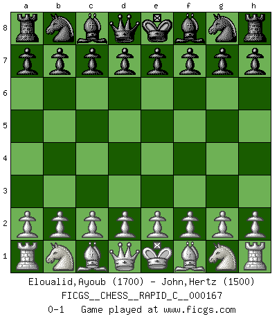 Last move : 0-1 2018 June 20 3:23:12 [Event "FICGS__CHESS__RAPID_C__000167"] [Site "FICGS"] [Date "2018.05.21"] [Round "1"] [White "Eloualid,Ayoub"] [Black "John,Hertz"] [Result "0-1"] [WhiteElo "1700"] [BlackElo "1500"] 0-1 This chess game has been lost on time (started : 2018.05.21 0:47:55) Player Black won this chess game. Follow this game move after move (download)Chess is mental torture. (Garry Kasparov) Spielt Blackmar-Diemer-Gambit, und das Matt kommt von selbst! (Emil Joseph Diemer) El ganar no lo es todo... pero el perder es nada. (Mednis) Il n'y a pas eu de défaite parce que je ne crois pas que cet ordinateur ait jamais existé. IBM a triché en refusant d'imprimer les modes de recherche de la machine. C'est évident, pendant le match, des coups décisifs ont été joués par des êtres humains. Aujourd'hui, les meilleurs spécialistes en informatique ne peuvent toujours pas expliquer comment Deep-Blue a pu jouer contre la logique des ordinateurs. IBM a gagné une guerre de communication, mais ils sont incapables de prouver que l'ordinateur a gagné tout seul. (Garry Kasparov) When the going gets tactical, the computers get going. (Hyatt)