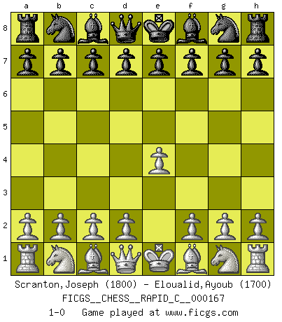 Last move : 1-0 2018 June 20 15:22:35 [Event "FICGS__CHESS__RAPID_C__000167"] [Site "FICGS"] [Date "2018.05.21"] [Round "1"] [White "Scranton,Joseph"] [Black "Eloualid,Ayoub"] [Result "1-0"] [WhiteElo "1800"] [BlackElo "1700"] 1.e4 1-0 This chess game has been lost on time (started : 2018.05.21 0:47:55) King's pawn Opening Player White won this chess game. Follow this game move after move (download)A passed Pawn increases in strength as the number of pieces on the board diminishes. (Capablanca) Obendrein hat der FIDE-Präsident den Revolutionsführer Gaddafi zum »Großmeister« ernannt, am Ende der WM. Das ist lächerlich! (Joel Lautier) La belleza de un movimiento no se refleja solo en su apariencia, sino en el pensamiento detrás de él. (Siegbert Tarrasch) Aidez vos pièces, elles vous aideront. (Paul Morphy) Remember : Your focus determines your reality. (Qui-Gon Jinn in Star Wars ep.1)