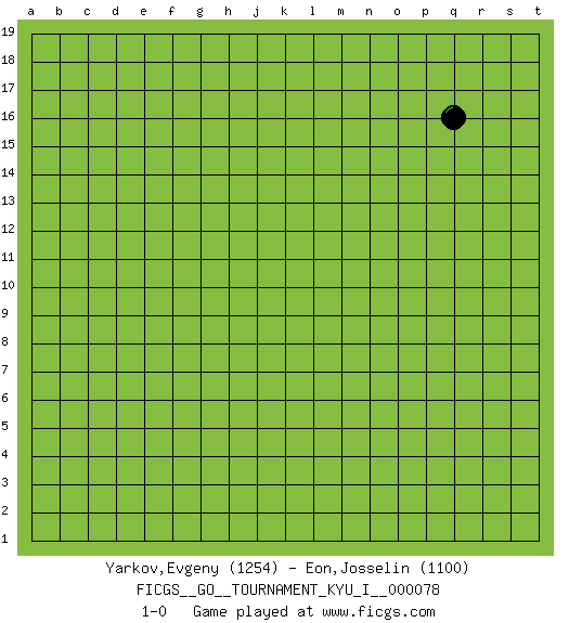 Last move : 1-0 2018 June 20 15:22:35 [Event "FICGS__GO__TOURNAMENT_KYU_I__000078"] [Site "FICGS"] [Date "2018.05.21"] [Round "1"] [Black "Yarkov,Evgeny"] [White "Eon,Josselin"] [Result "1-0"] [Rating 1 "1254"] [Rating 2 "1100"] 1.q16 1-0 This go game has been lost on time (started : 2018.05.21 11:47:3) Here are the names of the openings (joseki) played in the four corners : Player Black won this Go (weiqi, baduk) game. Follow this game move after move (download)White is always trying to kill a bigger group than black is trying to save. (Anonymous) There is a great deal of difference between an eager man who wants to read a book and a tired man who wants a book to read. (G.K. Chesterton)
