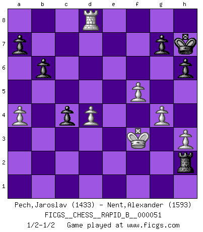 Last move : 1/2-1/2 2007 August 31 1:11:11 [Event "FICGS__CHESS__RAPID_B__000051"] [Site "FICGS"] [Date "2007.05.07"] [Round "1"] [White "Pech,Jaroslav"] [Black "Nent,Alexander"] [Result "1/2-1/2"] [WhiteElo "1433"] [BlackElo "1593"] 1.e4 e6 2.d4 d5 3.Nc3 Bb4 4.e5 c5 5.a3 Bxc3+ 6.bxc3 Ne7 7.Qg4 O-O 8.Bd3 Nbc6 9.Nf3 f5 10.exf6 Rxf6 11.Qh5 h6 12.O-O Bd7 13.Ne5 Be8 14.Qh3 c4 15.Be2 Nxe5 16.dxe5 Rf5 17.Bg4 Rxe5 18.Bxe6+ Bf7 19.Bxf7+ Kxf7 20.Rb1 b6 21.f4 Re4 22.f5 Ng8 23.Bf4 Nf6 24.Be3 Qd6 25.Bd4 Kg8 26.Qf3 Rae8 27.a4 Rh4 28.g3 Rhe4 29.Rbd1 Ng4 30.Ra1 Qc7 31.h3 Nf6 32.Kg2 Re2+ 33.Rf2 Rxf2+ 34.Kxf2 Ne4+ 35.Kg2 Rf8 36.g4 Re8 37.Rf1 Qd6 38.Qf4 Qxf4 39.Rxf4 Nd6 40.Bg1 Re2+ 41.Rf2 Re1 42.Rd2 Rc1 43.Rxd5 Rxc2+ 44.Kf1 Ne4 45.Rd8+ Kh7 46.Bd4 Nd2+ 47.Ke2 Nb3 48.Kf3 Nxd4+ 49.cxd4 Rh2 1/2-1/2 French : Winawer, Advance, poisoned pawn variation Kingside Castling by player Black (move 7) Kingside Castling by player White (move 12) This chess game ended in a draw. Follow this game move after move (download)I guess a certain amount of temperament is expected of Chess geniuses. (Ron Gross) Gewöhnliche Menschen denken nur daran, wie sie ihre Zeit verbringen. Ein intelligenter Mensch versucht, sie auszunutzen. (Arthur Schopenhauer) ¿Se han dado cuenta de que Fischer casi nunca ha tenido piezas malas? El las intercambia y las piezas malas se quedan con sus oponenets. (Yuri Balashov) On croit qu'il y a plus de mauvais joueurs que de bons joueurs, c'est faux : Il y a autant de joueurs qui gagnent que de joueurs qui perdent. (Philippe Geluck) Philosophers use a language that is already deformed as though by shoes that are too tight. (Ludwig Wittgenstein)