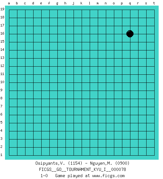 Last move : 1-0 2018 June 20 15:22:35 [Event "FICGS__GO__TOURNAMENT_KYU_I__000078"] [Site "FICGS"] [Date "2018.05.21"] [Round "1"] [Black "Osipyants,Vladimir"] [White "Nguyen,Minh Hieu"] [Result "1-0"] [Rating 1 "1154"] [Rating 2 "0900"] 1.q16 1-0 This go game has been lost on time (started : 2018.05.21 11:47:3) Here are the names of the openings (joseki) played in the four corners : Player Black won this Go (weiqi, baduk) game. Follow this game move after move (download)In the sound of the stone you can hear its purpose. (Pierre Audouard) It's not a bug - it's an undocumented feature. (Anonymous)