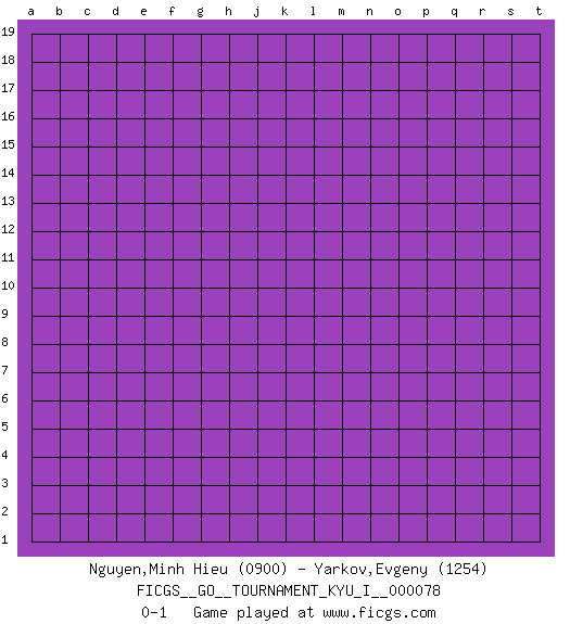 Last move : 0-1 2018 June 20 15:22:35 [Event "FICGS__GO__TOURNAMENT_KYU_I__000078"] [Site "FICGS"] [Date "2018.05.21"] [Round "1"] [Black "Nguyen,Minh Hieu"] [White "Yarkov,Evgeny"] [Result "0-1"] [Rating 1 "0900"] [Rating 2 "1254"] 0-1 This go game has been lost on time (started : 2018.05.21 11:47:3) Here are the names of the openings (joseki) played in the four corners : Player White won this Go (weiqi, baduk) game. Follow this game move after move (download)Go is not a blocking game, it's a game of action. (Pierre Audouard) Empty your mind, be formless, shapeless — like water. (Bruce Lee)